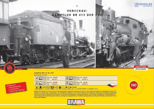 4.5.2012 >> Ďalšia horúca NOVINKA avizovaná na 4. kvartál 2012 od firmy BRAWA - parná lokomotíva H0 rady 413.073 ČSD, prevedenie analóg (40736) ale aj zvuková s dymovým generátorom (40738). |