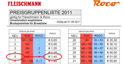 4. Cenu za náhradný diel zistíte podľa cenovej skupiny (Preisgruppe) z produktového listu náhradných dielov a nasledovnej tabuľky (na stiahnutie súbor PDF 47 KB, stĺpce Preisgruppe NEU a Preis). Napríklad k produktu 62161 (Dampflokomotive BR 44 der DRG) náhradný diel 4 pozícia = 92378 (Luftpumpe rechts) cenová skupina 5 má cenu 1,40 €. |